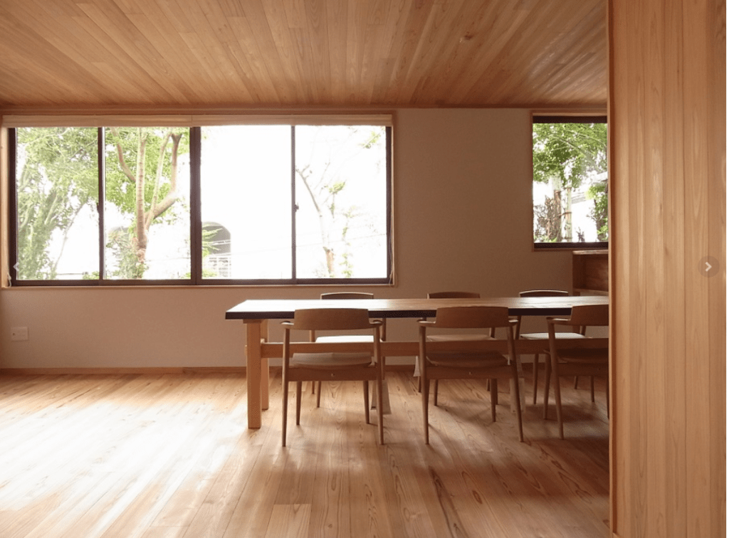 床だけでなく天井も全て板張りにし、何か所かの壁も板張りにしました。