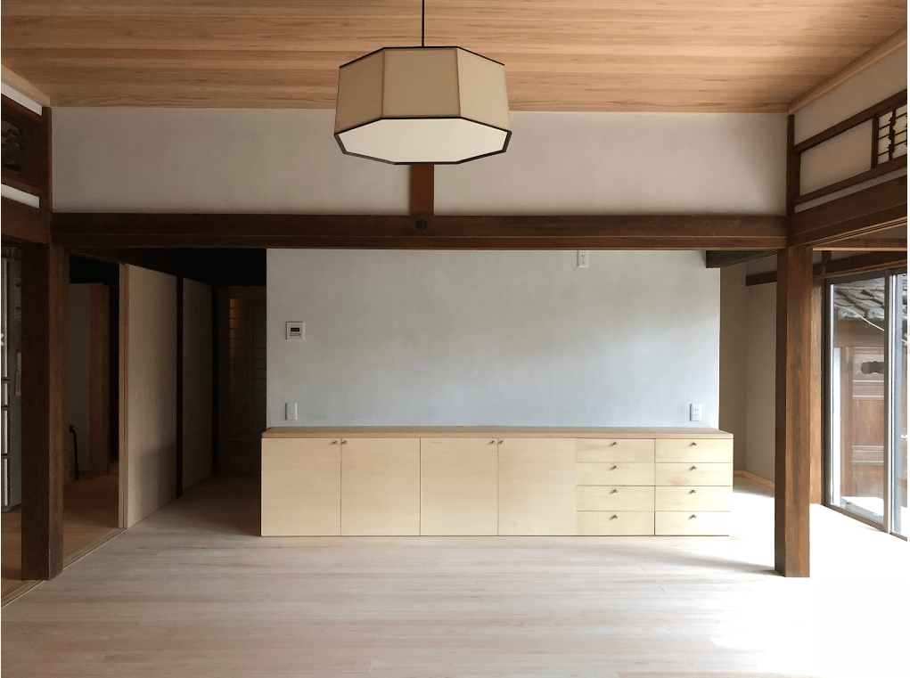 工事中に仕切っていたキッチン食堂側との間仕切り板も取り外され、広々とした空間になりました。