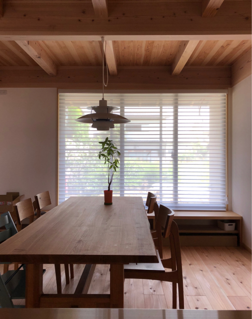 食堂には小上がりの掃き出し窓があり、長いベンチからウッドデッキに出ることが出来ます。ウッドデッキの工事はこれからです。