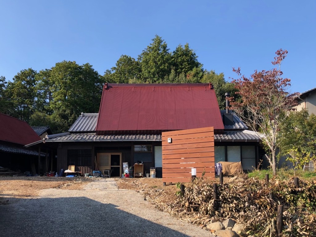 建物外部は痛みのあった東の落ち棟と東の下屋部分の瓦の葺き替えを行い、大屋根(茅葺きの上に鉄板張り)は塗装をし直しました。塗装の色も当初と同じ赤色にしています。界隈の民家では茅葺き鉄板張りの民家の屋根は赤色に塗装されているところが多く、これも時代の変遷で発生したことですが(生業等の変化もあり集落での茅の葺き替えが日常的に行えなくなり、雨漏りを防ぐために鉄板を上葺きすることになった)、赤色に塗装されているところが多いのは地域性もあるように思います。