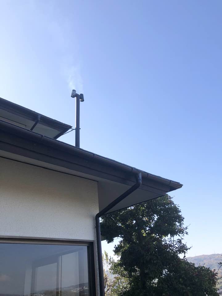 煙突の最低長さと支え脚の設置位置関係で、2階の軒の上まで延ばしました。2箇所で支えています。
