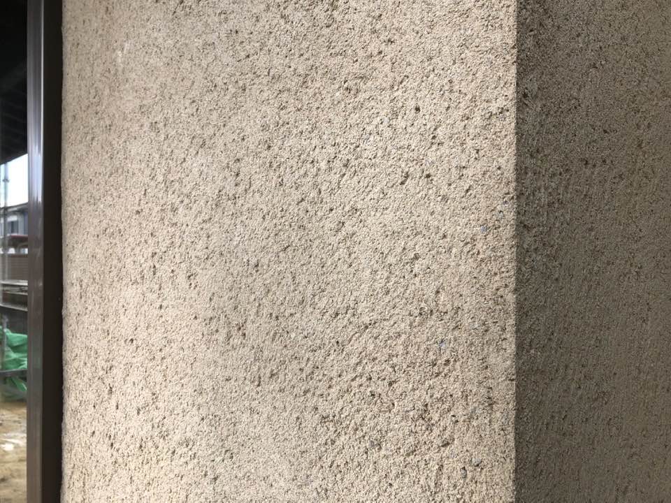 外壁仕上げは色モルタル掻き落とし仕上げで、土色の仕上げにしています。