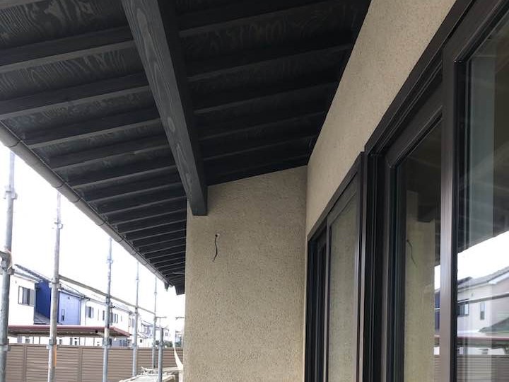 リビングの前は軒を深くしています。桁、垂木、野地板とも化粧現しにして外部用の塗料を塗っています。