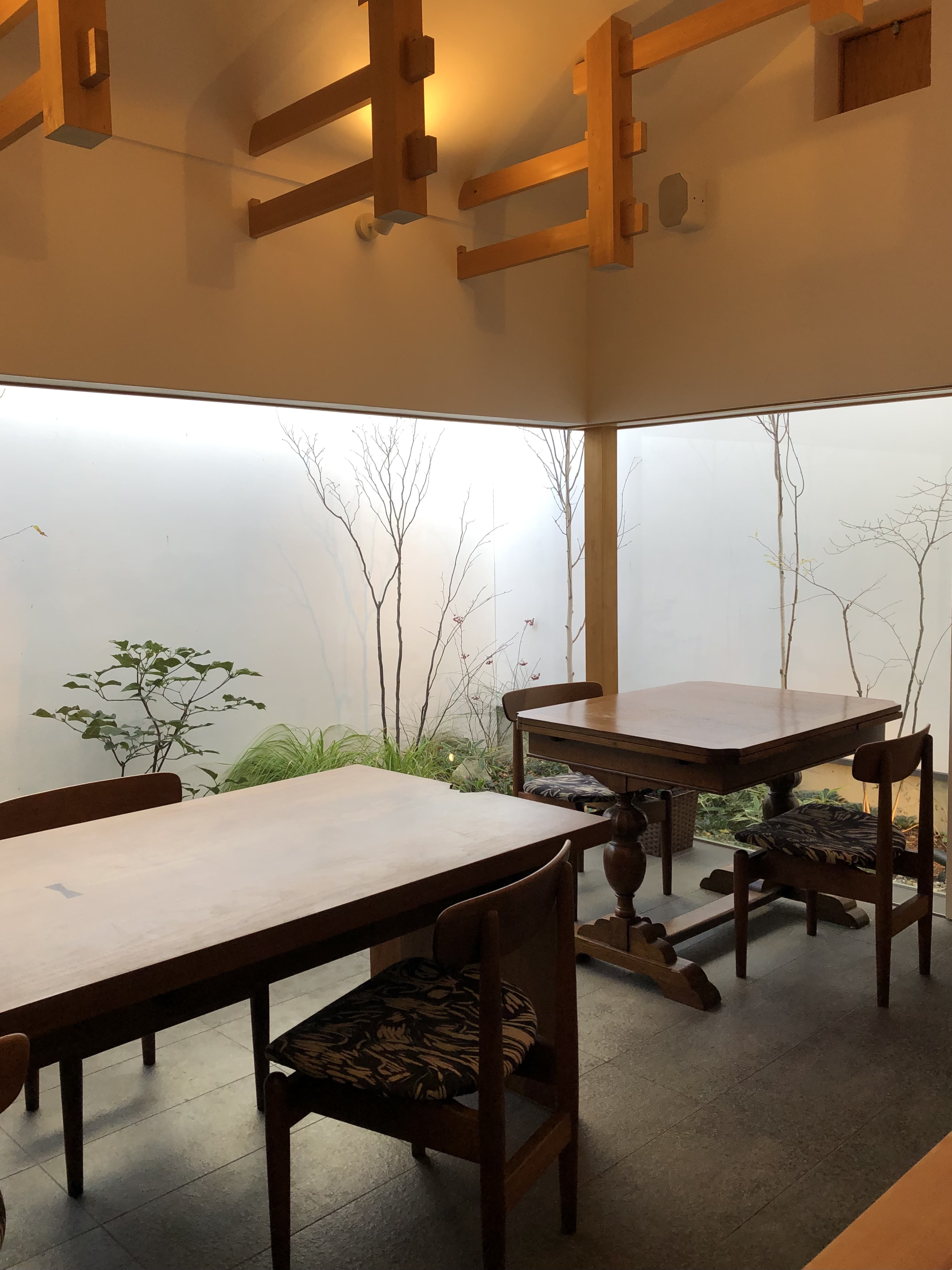 こちらも細い庭を楽しむことが出来る落ち着いた席です。白い壁内の植栽が美しく感じます。