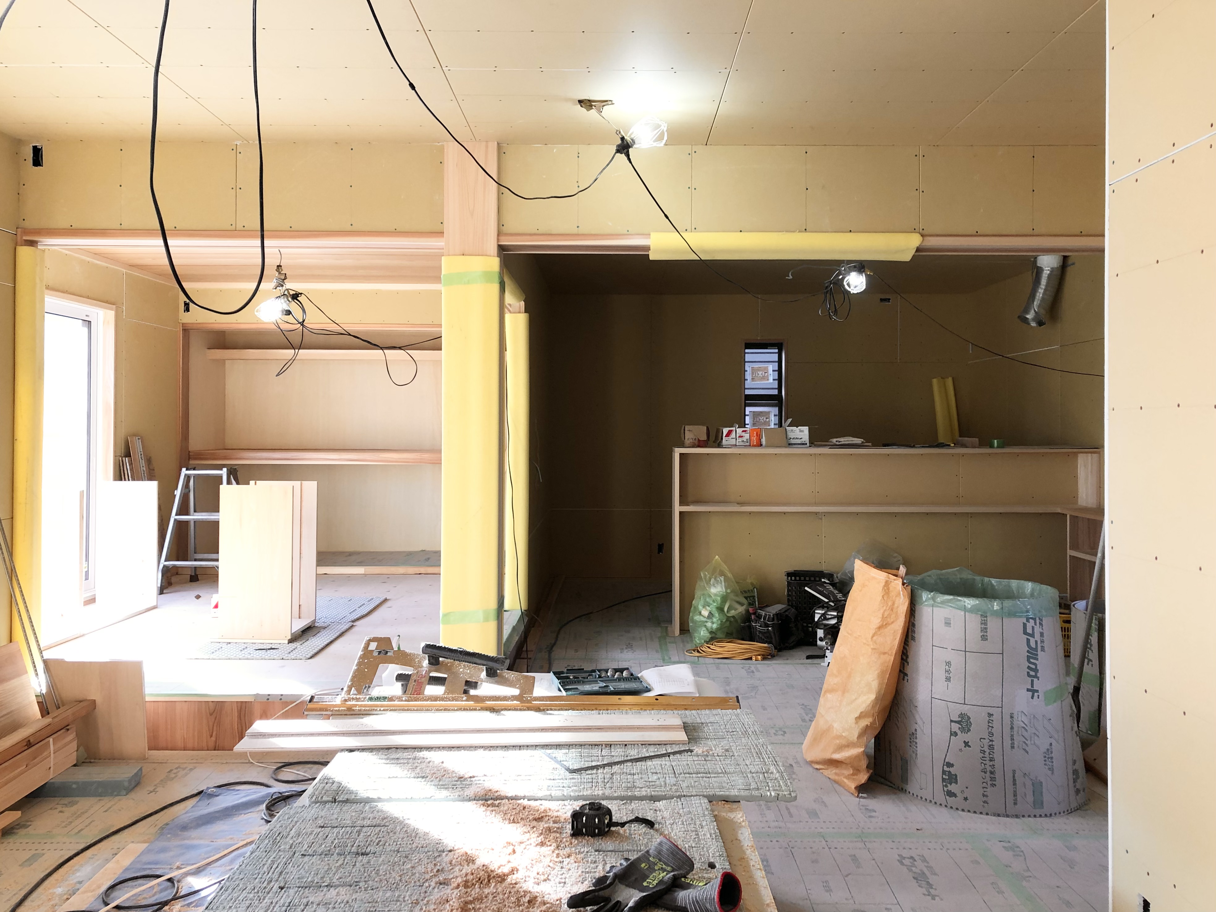 キッチンの対面カウンターも完成。和室の押入内の中段と枕棚も設置完了。この押入には京唐紙の襖が入ります。リビングにも京唐紙のパネルを掛けるニッチを設けています。