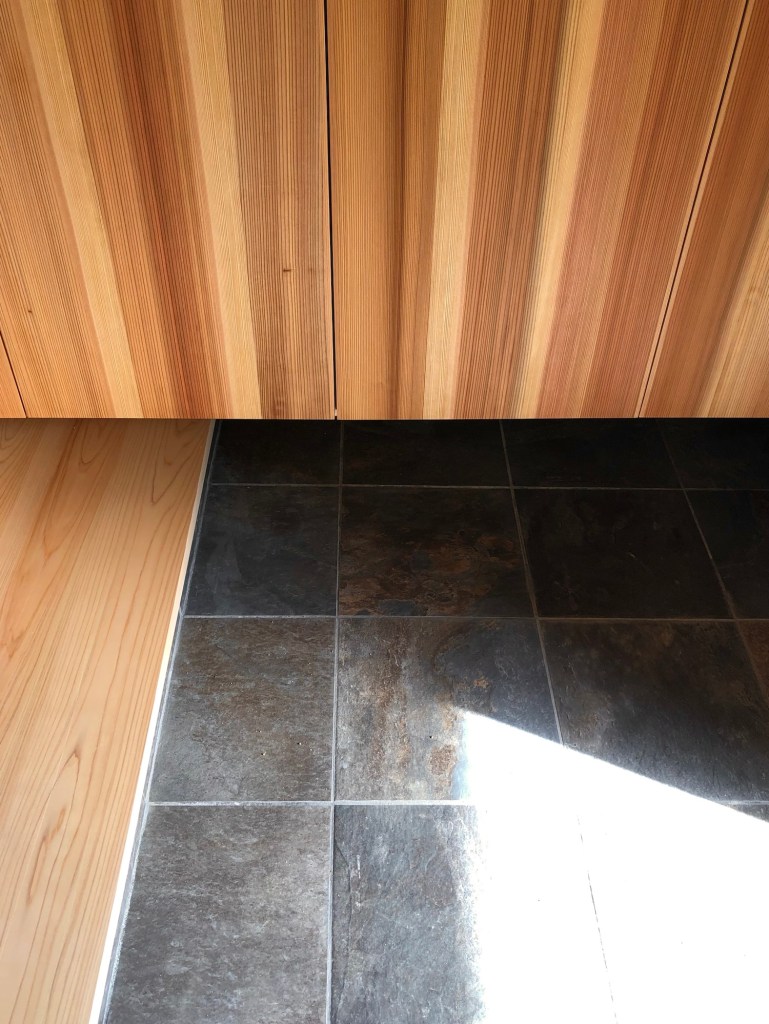 床の養生シートが取れました。玄関の様子。床天井は吉野杉の上小板。天井は赤身です。