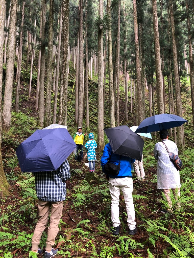 今回の見学会は水がテーマ。あいにくの雨でしたが、実際に降っている雨が樹々の葉に当たり、腐葉土の地面に染み込む様子や、川の流れ、山に出る霧などを見ていると森と水の関係をより感じることが出来たように思います。