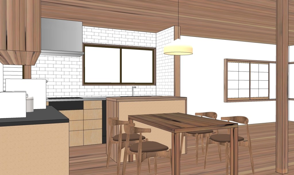 キッチンの向きを変え、ユーティリティーを併設してキッチンから洗面脱衣室への動線を作ります。既設の据え付け家具も再利用させていただきます。仕上げは吉野杉を多く使います。