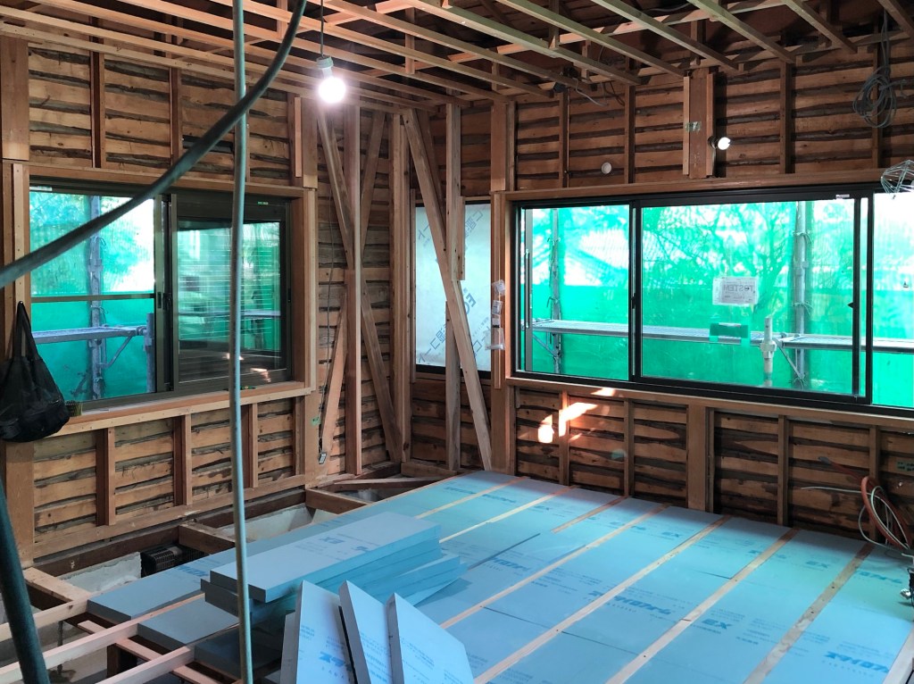 LDKまわりは床の断熱材を入れて床下地の合板を張り終えたところです。