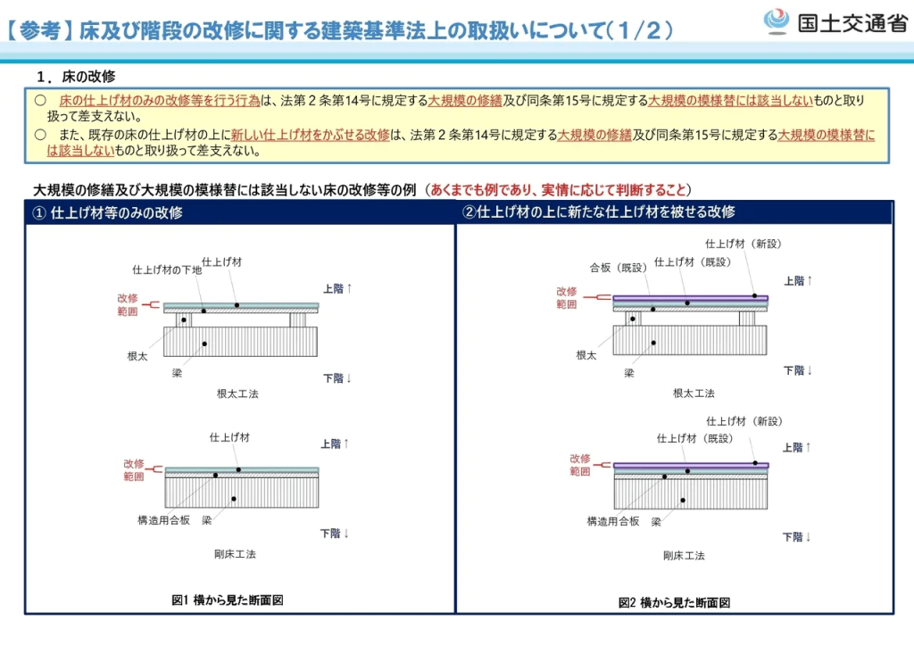 事例の図(確認申請不要の事例)は仕上げの薄い部分のみが改修範囲となっていますが、ボンドで下地合板にバリバリに接着している場合も多く、そのような場合は仕上材だけを剥がすことが出来ないので下地合板も含めての改修でも問題ないように思います。また、根太にもボンドで下地合板を接着していることもありますので、その場合はどうなるのか。着工(解体)前に確認申請を出すのが基本ですが融通がどこまで効くかはわかりません。(「実情に応じて判断すること」というのはそのようなこも含めてとのように読めます。)