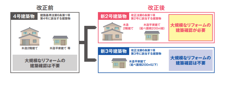 ※現在の4号建築物は改正後は新2号建築物と新3号建築物に分けられて名称が変更されます。
