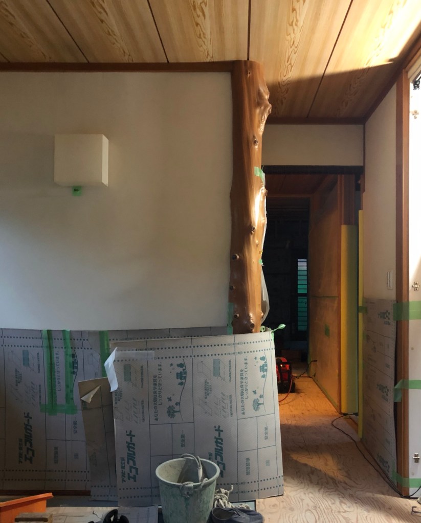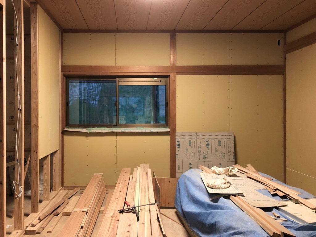 二階の和室は10畳を8畳に縮め、断熱材を入れて耐力壁を補強しました。真壁の化粧柱や長押、付鴨居はそのままで面材の補強をして頂いています。大壁にすると簡単ですが、和室の雰囲気を変えずに真壁のままで納まるよにして頂きました。