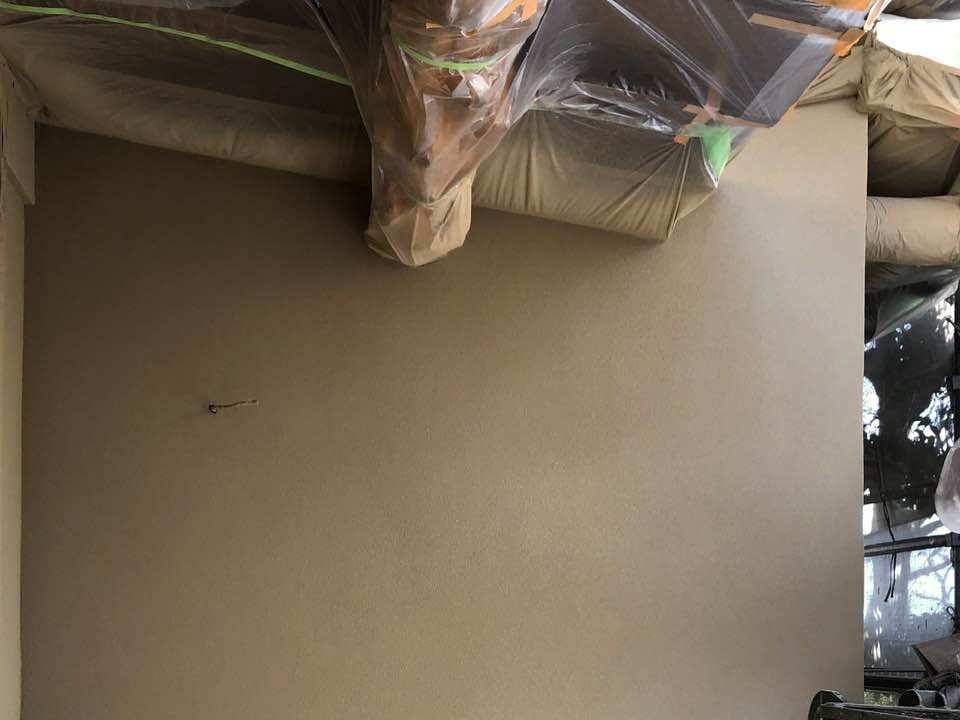 元の外壁は白系のスタッコ押さえ仕上げだったため表面の凹凸が大きかったのですが、じゅらくの吹付仕上げをするためには表面を平滑にしなければならず、カチオンを塗り下地をしごいて下地面を平滑にした上に吹き付けることになりました。