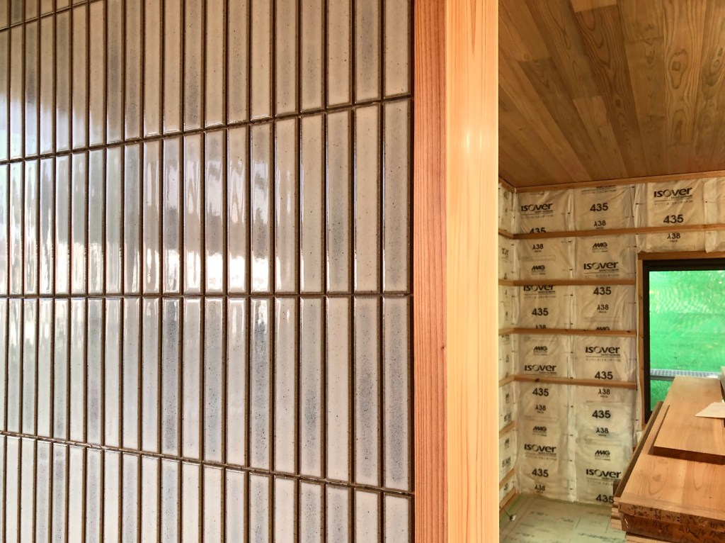 キッチンのタイルは、単色ではなく焼き物の風合いが感じられる趣のあるタイルです。