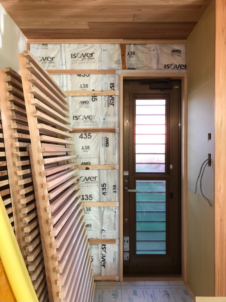 キッチン横のスペース。勝手口は元々使われていた複層ガラスの通風の出来るタイプです。横に置かれているのは外部の木製面格子。4箇所の窓に設置します。