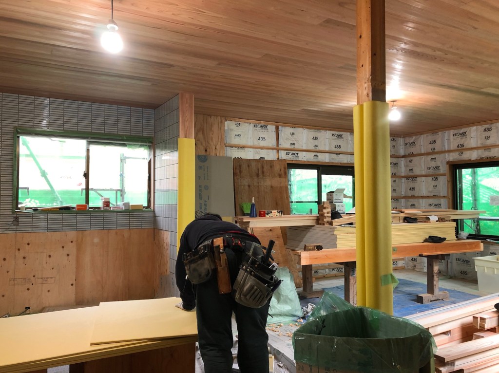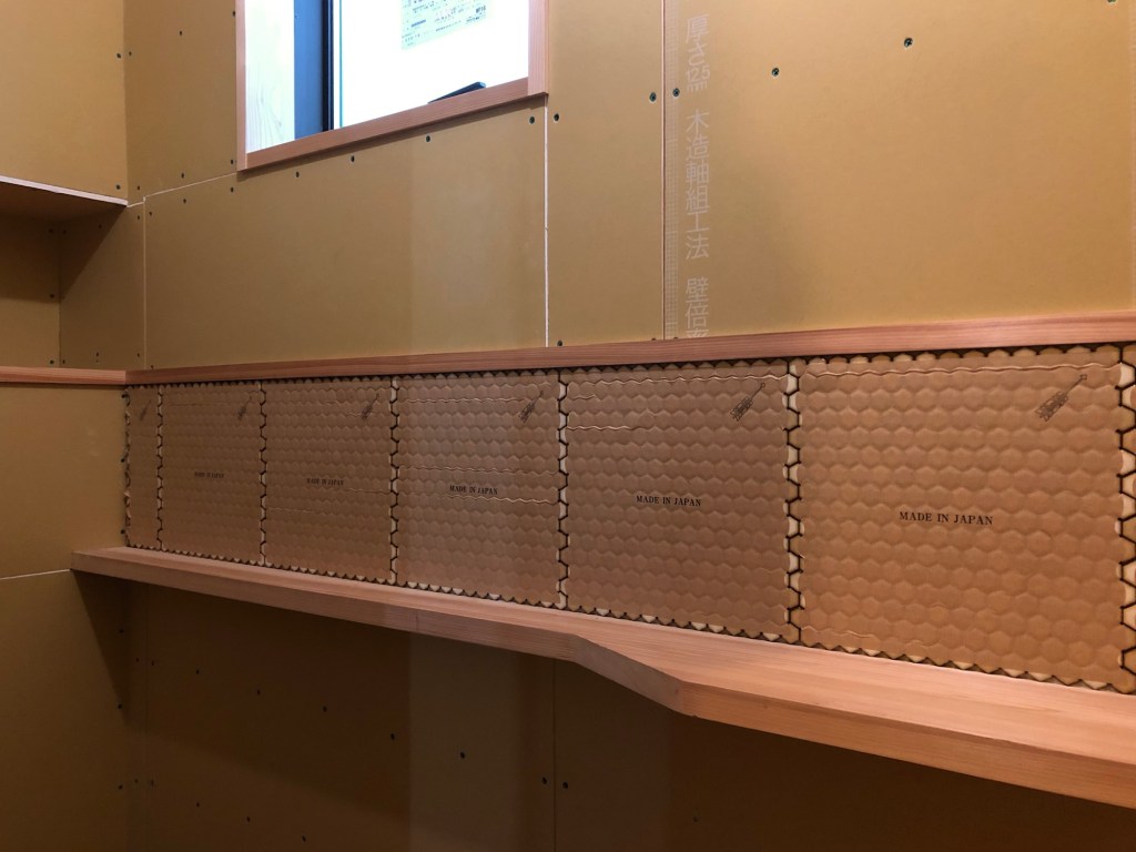 一階のトイレ。長いカウンターを設置し、手前側の幅が広いところに小ぶりの手洗い器を置きます。カウンターの上の壁は六角形のモザイクタイル張り。(まだ表面にシートが貼られています。)