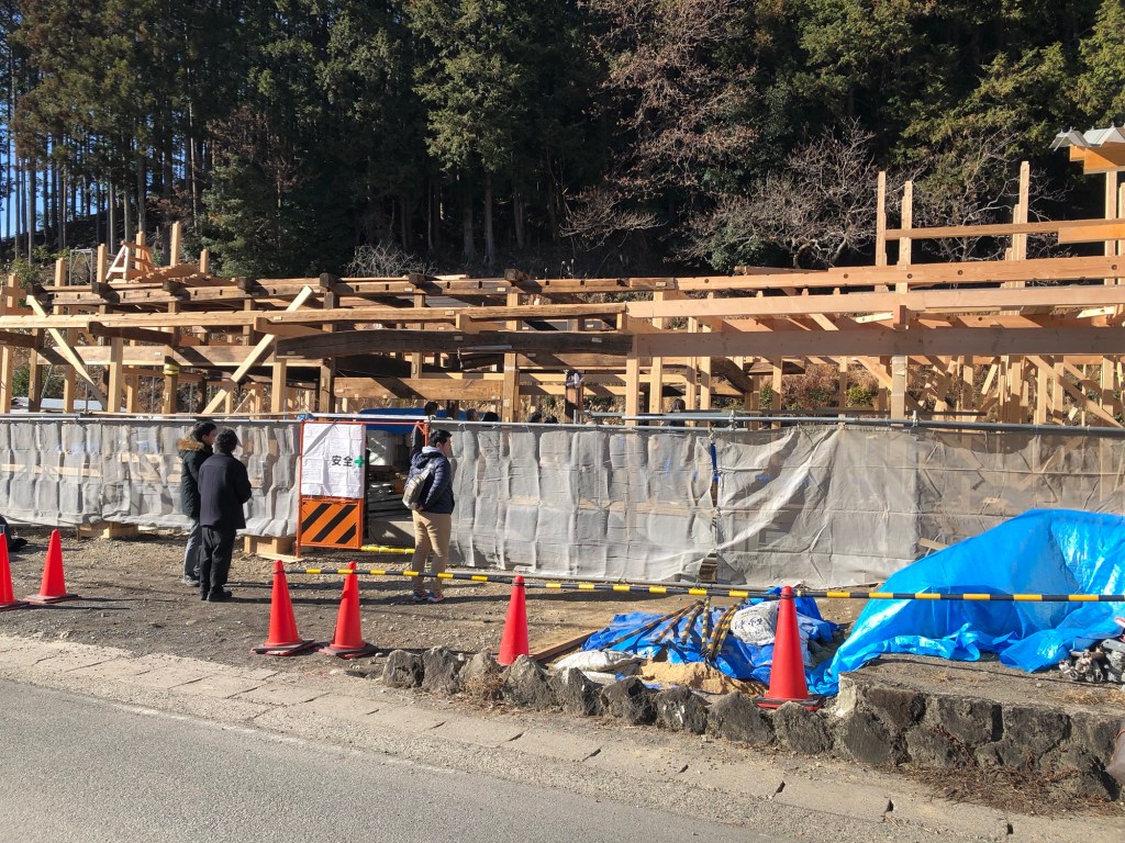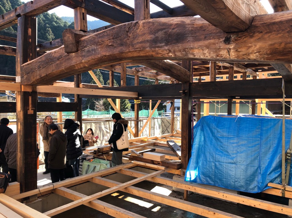 各部材に番付がつけられています。その場その場で判断しなければならないことも多いようですが、施工者の山本棟梁は「このような移築の現場仕事は本当に楽しくてワクワクします。みなさんも是非、移築再生の設計をして下さい」と仰っていました。大工さんや職人さんが楽しみながらやり甲斐を持ってお仕事をして頂けることは、とても理想的だと思います。