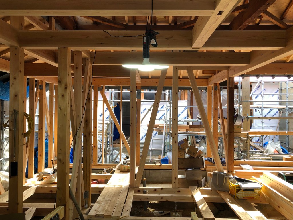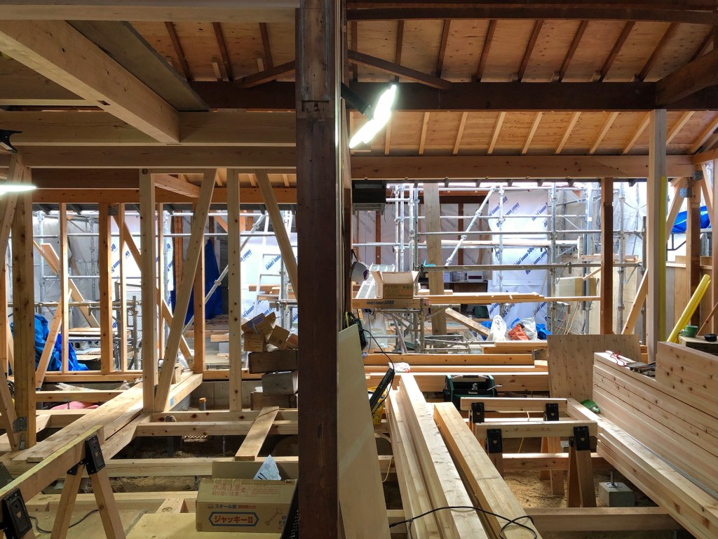 新たな梁はほぼ化粧梁です。吉野杉の良い材を使って頂いています。小屋裏部屋の下は天井を低くして化粧梁を見せます。