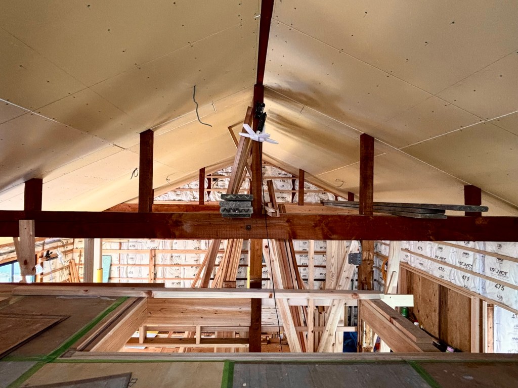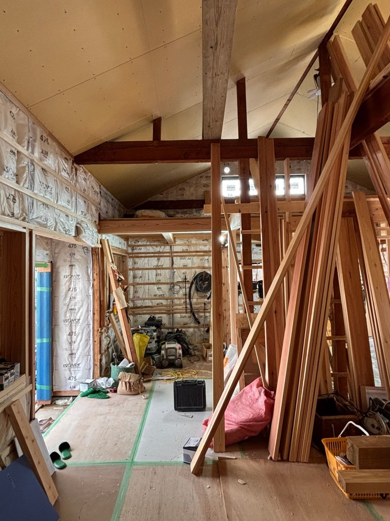 小屋裏部屋も形になってきました。天井は低めですが、小屋裏空間を利用して変化のある空間が出来ました。窓も設け、明るさも確保しました。