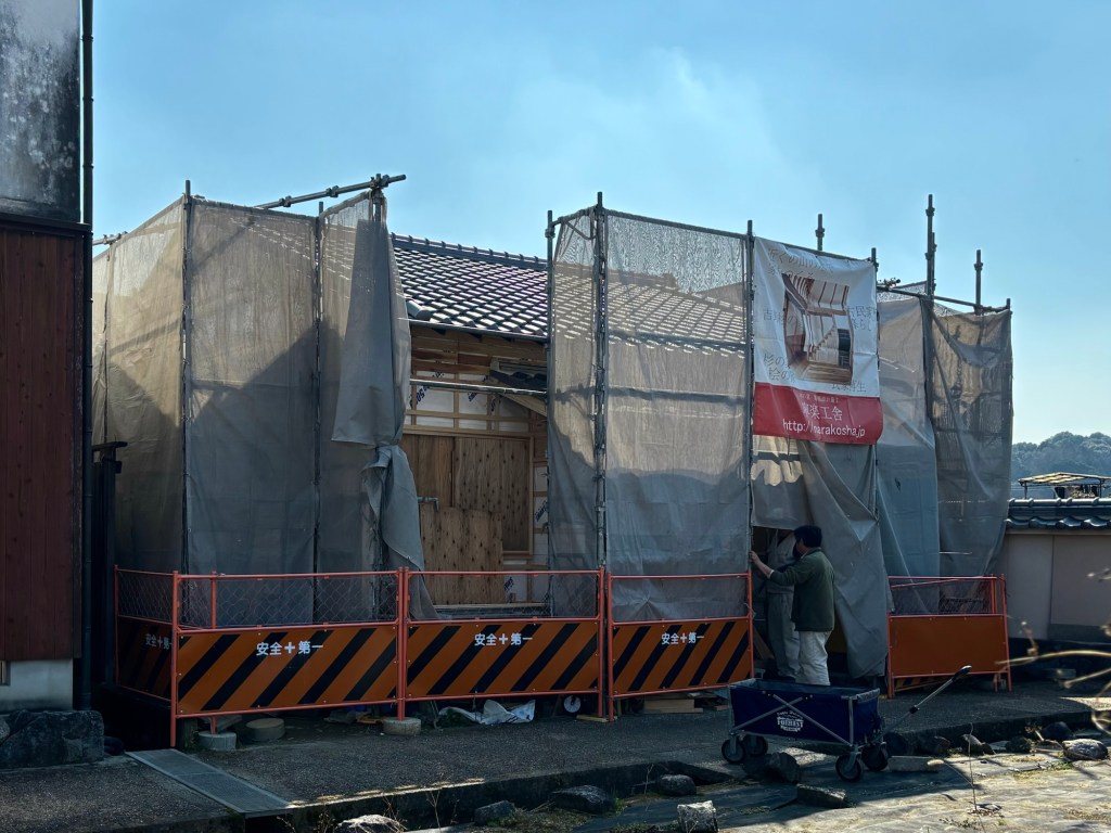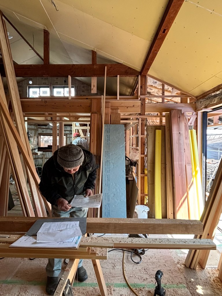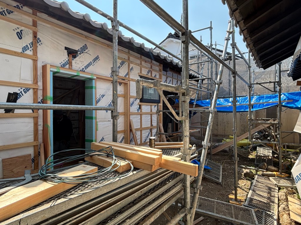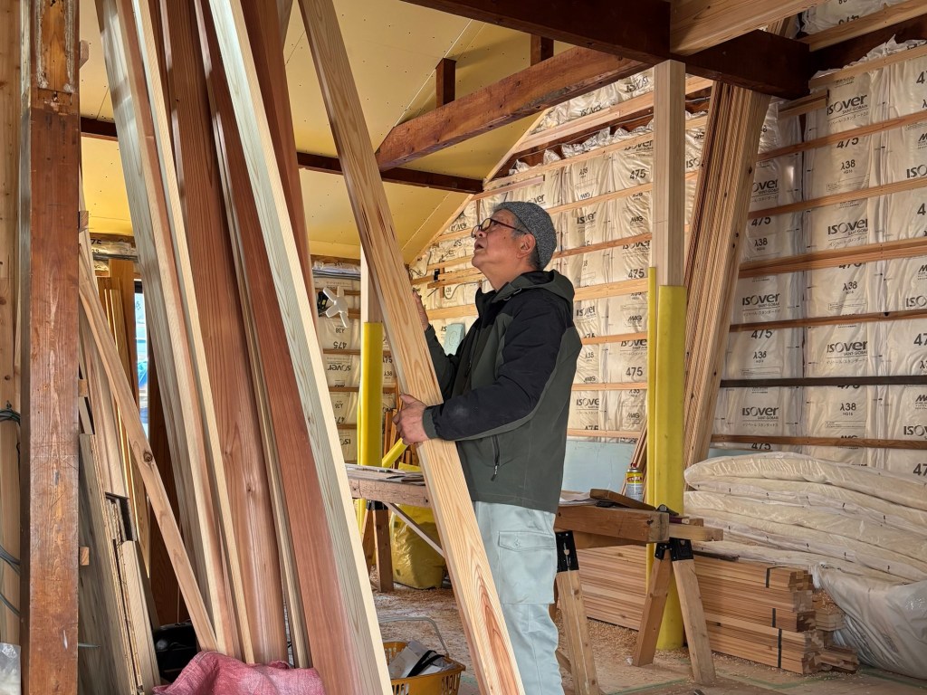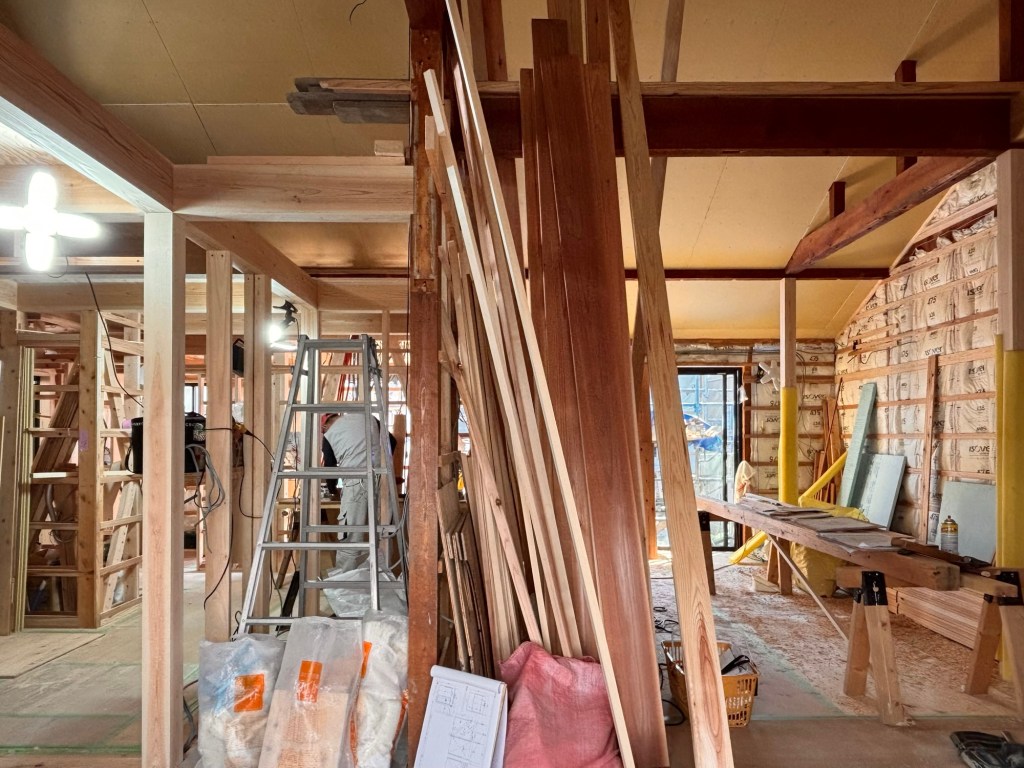 大工さんが枠材の設置を進めておられます。現場は多くの材料が搬入されています。