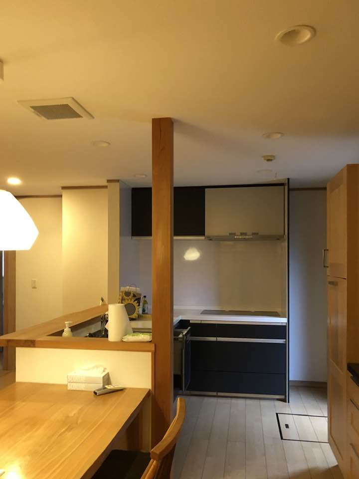 家全体としては大きな間取りの変更はしていませんが、ダイニング奥にユーティリティーを設け、キッチンからユーティリティーを通って洗面脱衣室に通じる動線を設けました。正面の出っ張った壁のところの奥がユーティリティーです。