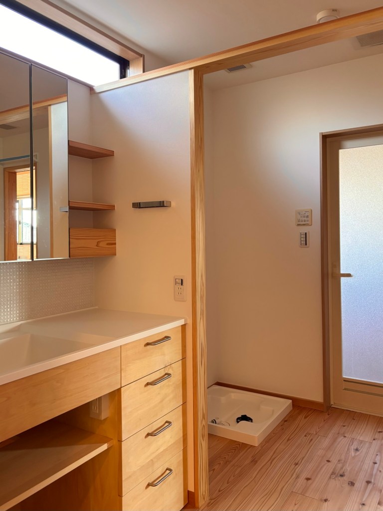 廊下側から洗面脱衣室に入ったところ。洗面と脱衣室の間に仕切り壁を設け、脱衣室を独立させるためのカーテンやスクリーンをつけることも出来るように鴨居を通しています。元々あった高窓からの明るさはどちらにも共有できるように仕切り壁は窓下までとしています。