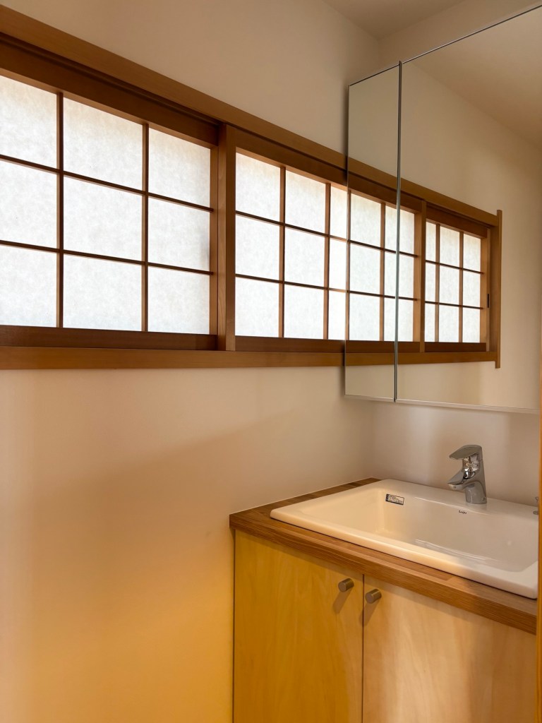 元々和風の住まいで、玄関や廊下などのちょっとした窓にも障子が入っています。2階の廊下に新たに洗面台を設けましたが、障子はそのまま残しました。鏡の効果で長い障子窓のように見えます。