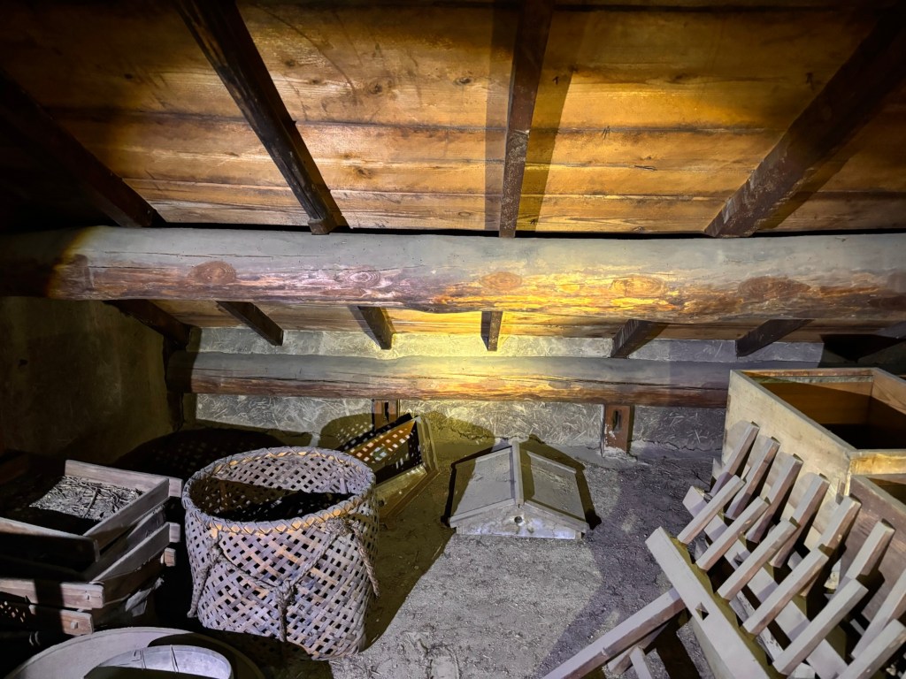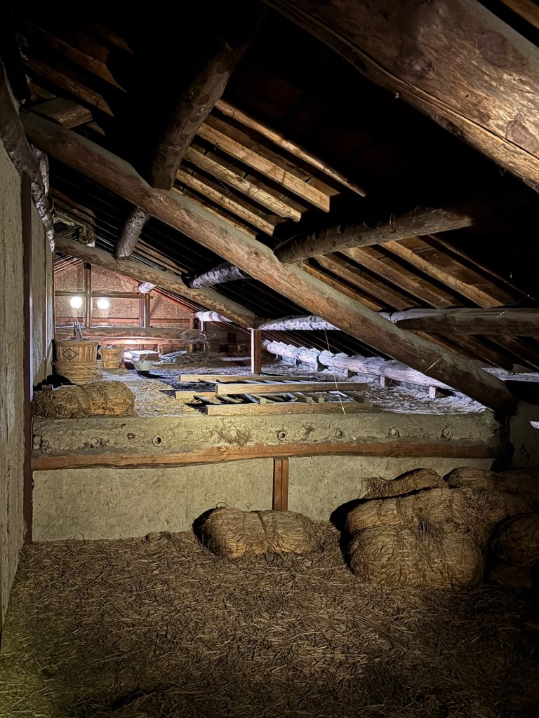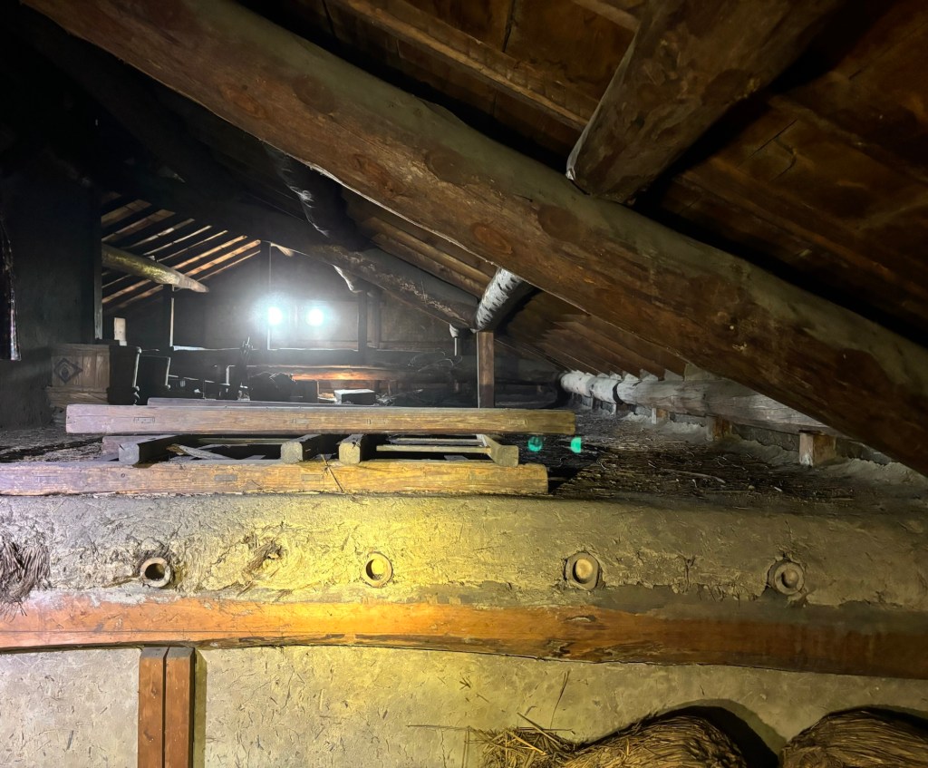 写真は北側半分のつし部分です。棟下部分に仕切り壁があり、南側は室内から箱階段で上がる小屋裏部屋になっています。生活空間の表と裏と小屋裏の使い方が、上手く考えられているなぁと思います。