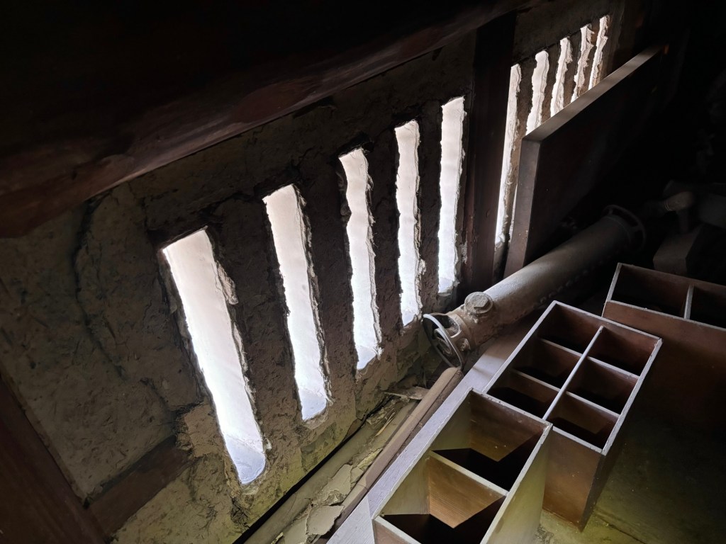 垂木と垂木の間の隙間を塞ぐ面戸も左官で塗り固められていました。(一緒に登った工務店の田畑さん発見。)一般的な民家では、藁を細長く丸めたもので塞いでいるのがそのまま見えるケースが多いのですが、裏も丁寧に仕上げられています。