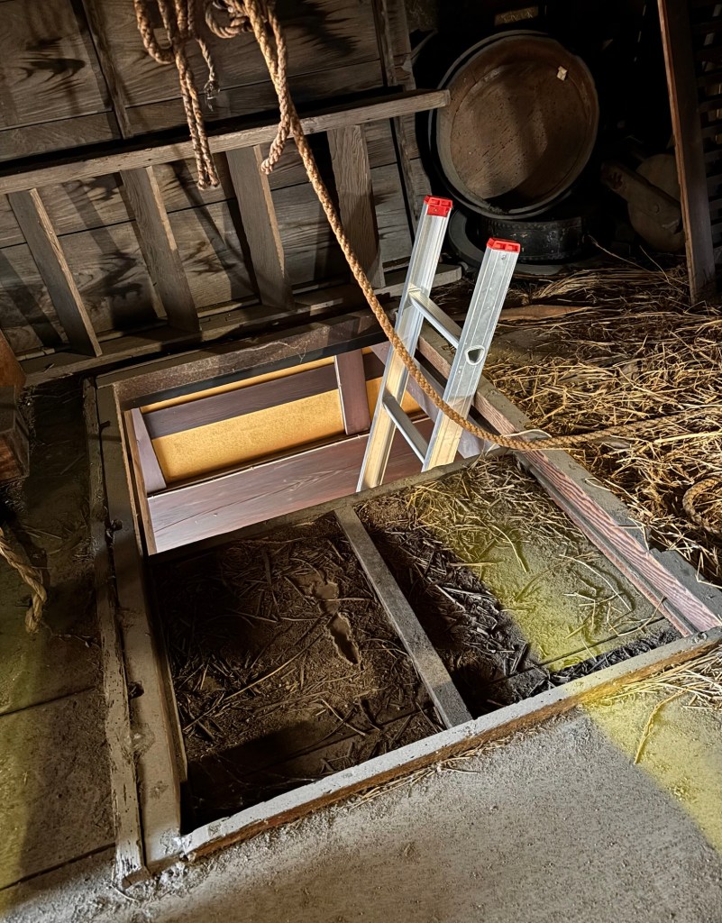玄関土間の天井がスライドして開くようになっており、ここからハシゴで上がります。重い荷物の上げ下ろしのための装置も健在です。玄関上とミセの上は土は無く、野地板上に藁が敷かれていました。
