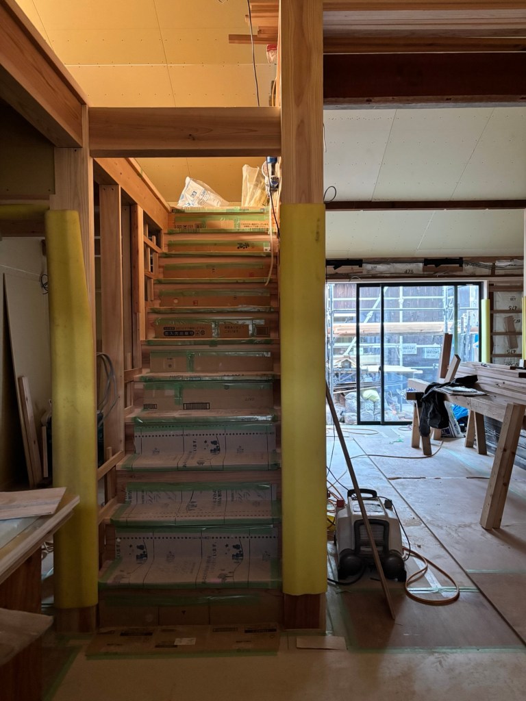 母屋は小屋裏部屋に行く階段が完成しました。上がった先は天井が低いのですが、ハシゴで上がるよりも安全で荷物の出し入れも便利です。