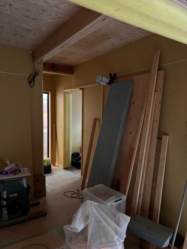 小屋裏部屋の床は新たに梁を掛けて作っています。階下の天井を低めにしていますが、高さ寸法はギリギリのところで設計しています。