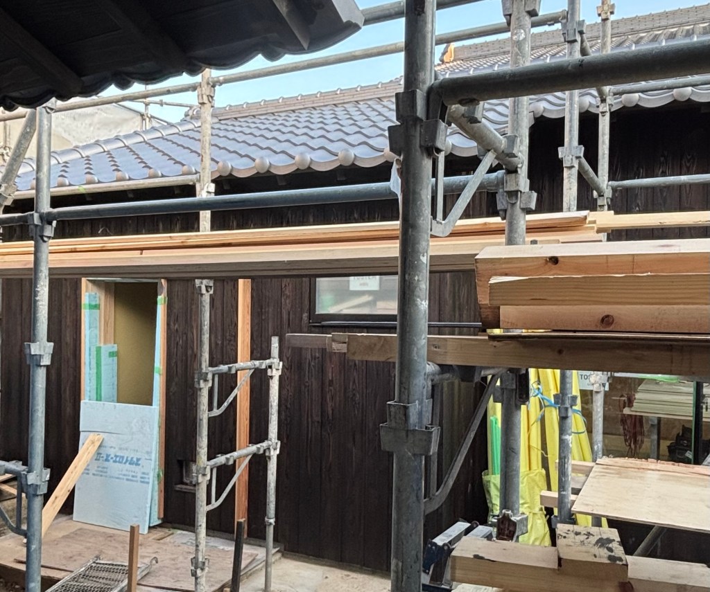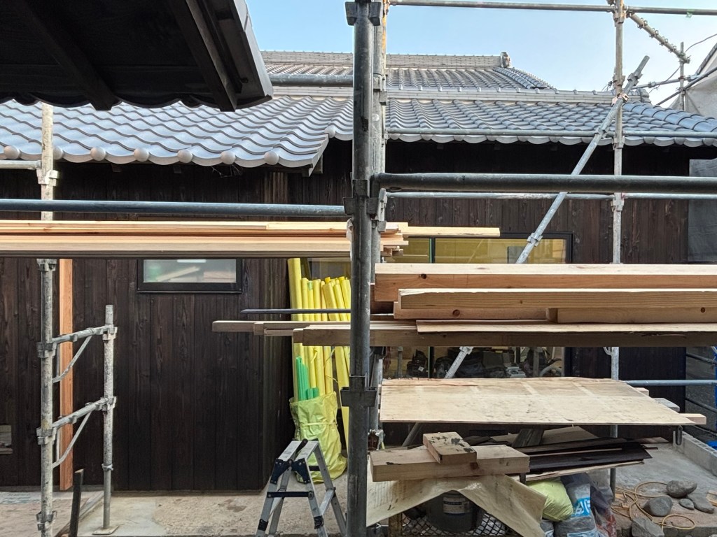 外壁の板張り工事が始まり、離れ棟は張り終わりました。