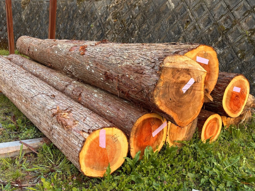 120生の杉の原木丸太、末口40cm〜、長さ4mの元(一番玉)と二番玉です。桶用材として使われるものを除いた原木の中から、7本を選ばせて頂きました。
