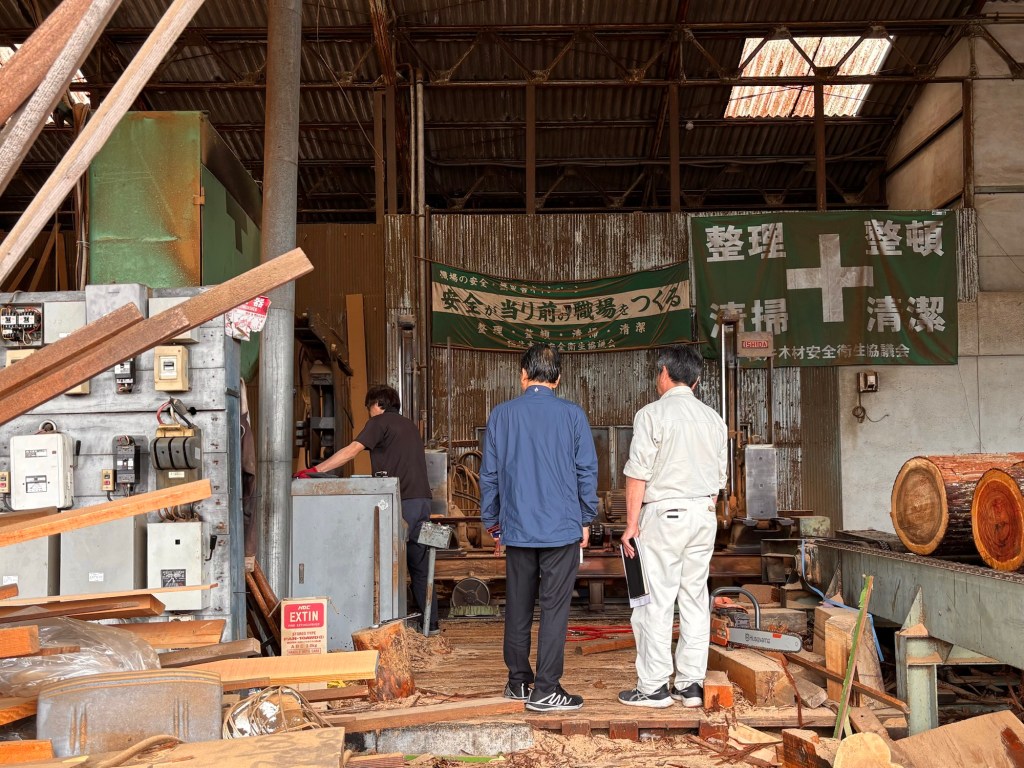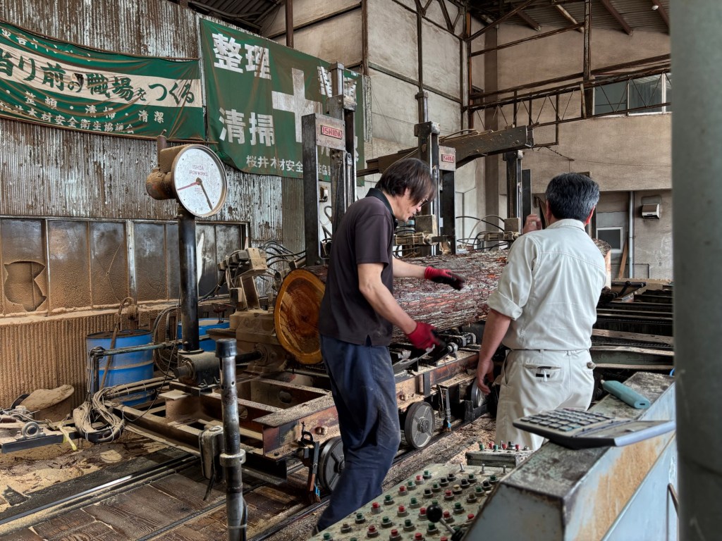 ホーテックの堀内さんと寧楽工舎の田畑さん。堀内さんからは板材の製材のポイントなど教えて頂きました。いつも木や山のこと、製材のことをたくさん教えて頂いており、質問しても何でも答えてくださる師匠のような方です。