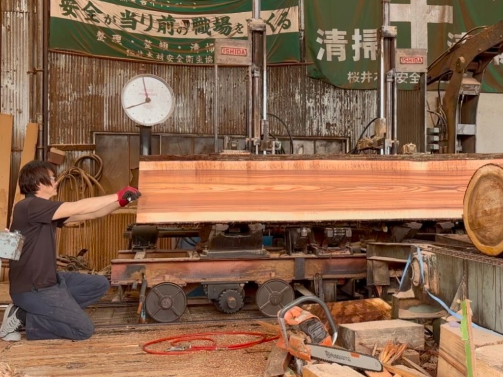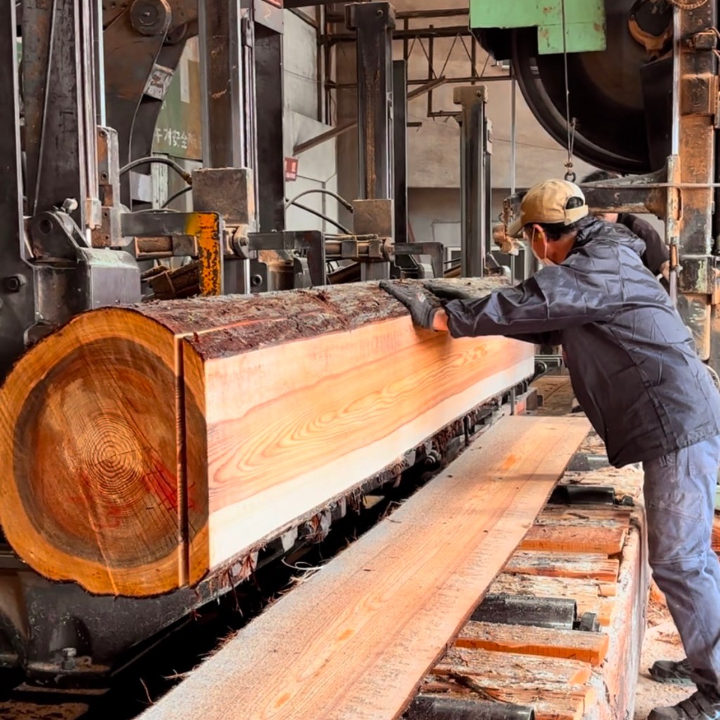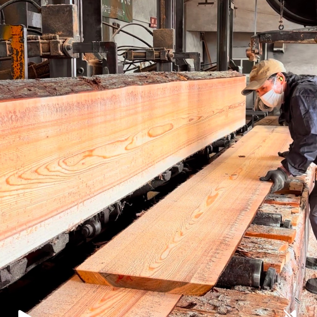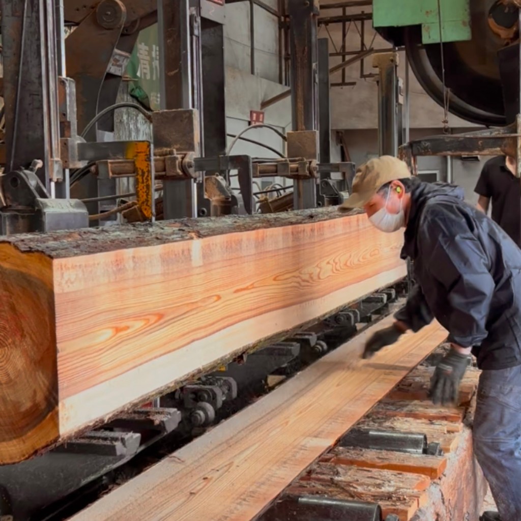 丸太の両側から板厚で木取りをし、中央の幅を決めて一枚ずつ製材されます。