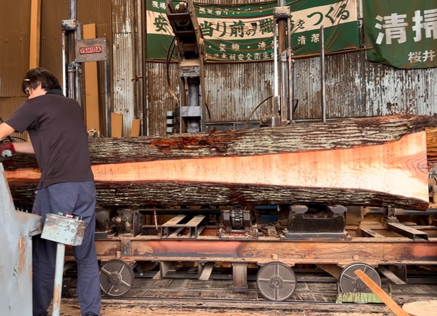 板の厚みで挽いているところ。どんな板目が出てくるか、緊張の一瞬です。