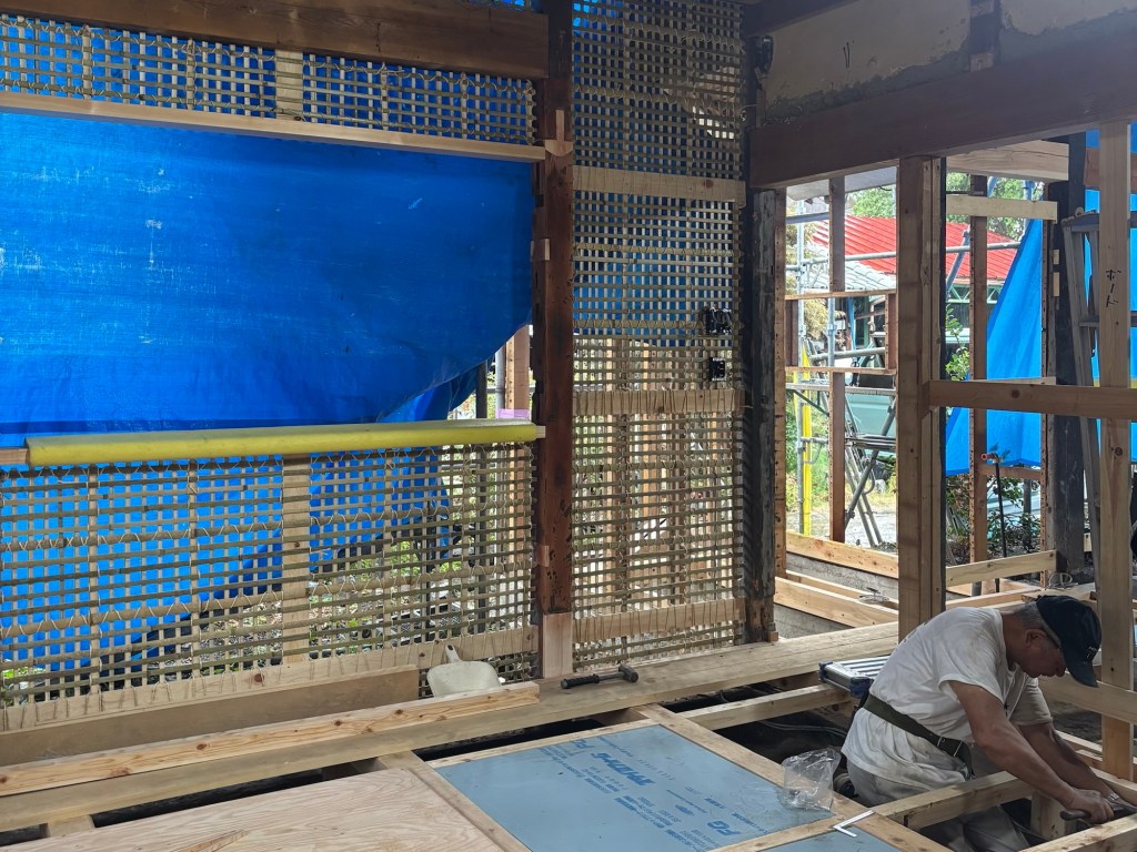 古い柱の欠損部は埋木をして頂きました。床の断熱の施工中の様子。北側の部屋なので遠赤外線の床暖房を敷設します。その為に床板の下地として合板を張っています。