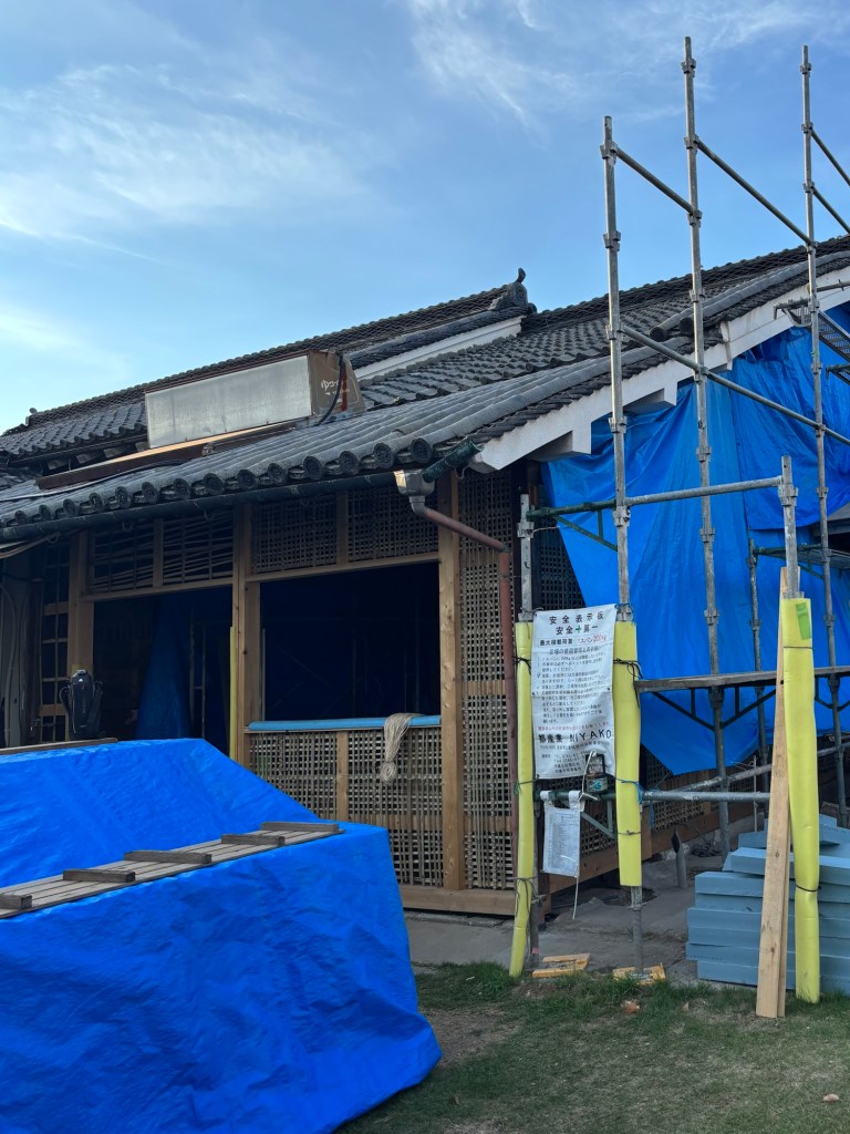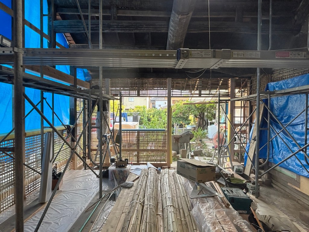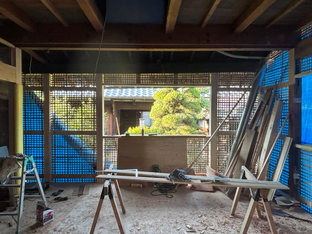 貫の痕跡や柱に付く土の痕跡を見ても、建築当初は土壁だったことがわかります。昭和の改修時に土をきれいに撤去されたようで、改修前は壁内に筋交と断熱材が入っていました。その当時は新しい方法として施工されていたと思いますが、今回伝統構法の柔軟性を取り戻し、室内環境もよくするために元の土壁に戻す工事をしています。室内は土壁の真壁で仕上げます。