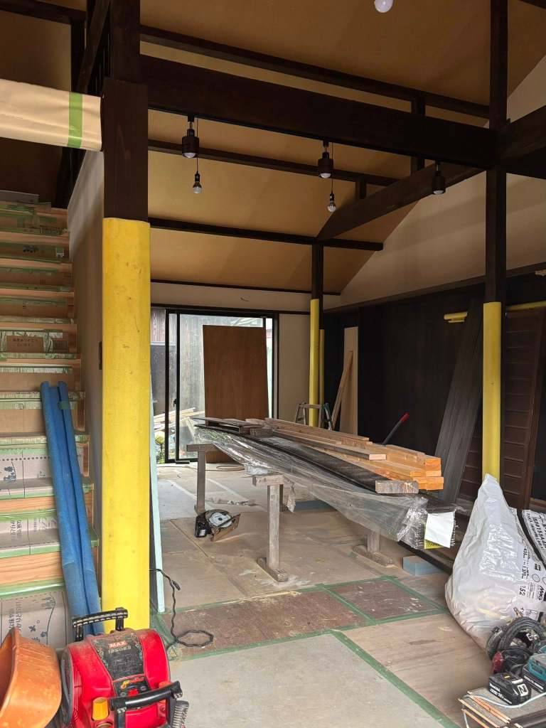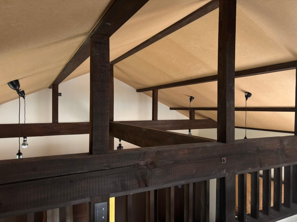 元から使われている梁や束は化粧材ではないので粗い仕上げですが、柿渋の古色を塗って良い感じになったと思います。新材と旧材が混じっていますが違和感なく納まりました。