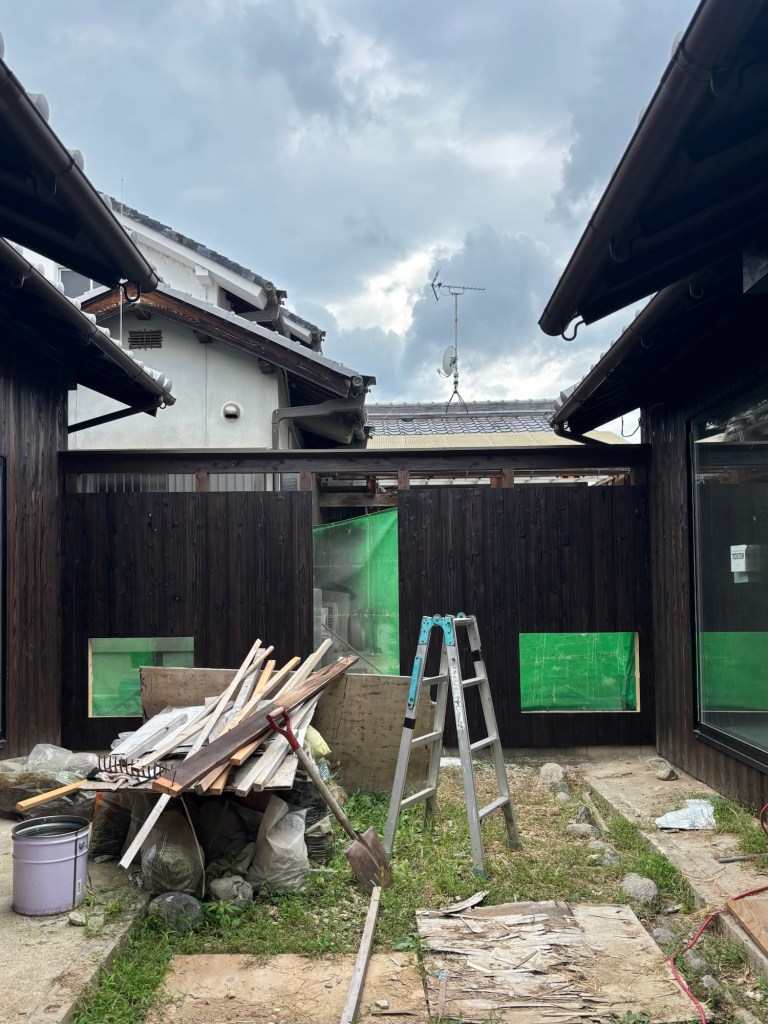 中庭の塀も出来上がってきました。真ん中の空間には扉が付きますが、二つの穴は・・・。