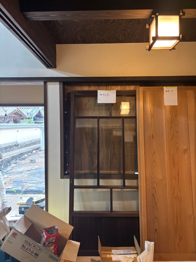 ガラス建具も使用します。輸送中にガラスが割れることもあるので心配しましたが、問題なく現場に運び込まれました。少し古いガラスが入っており、シンプルな良い建具ですね。