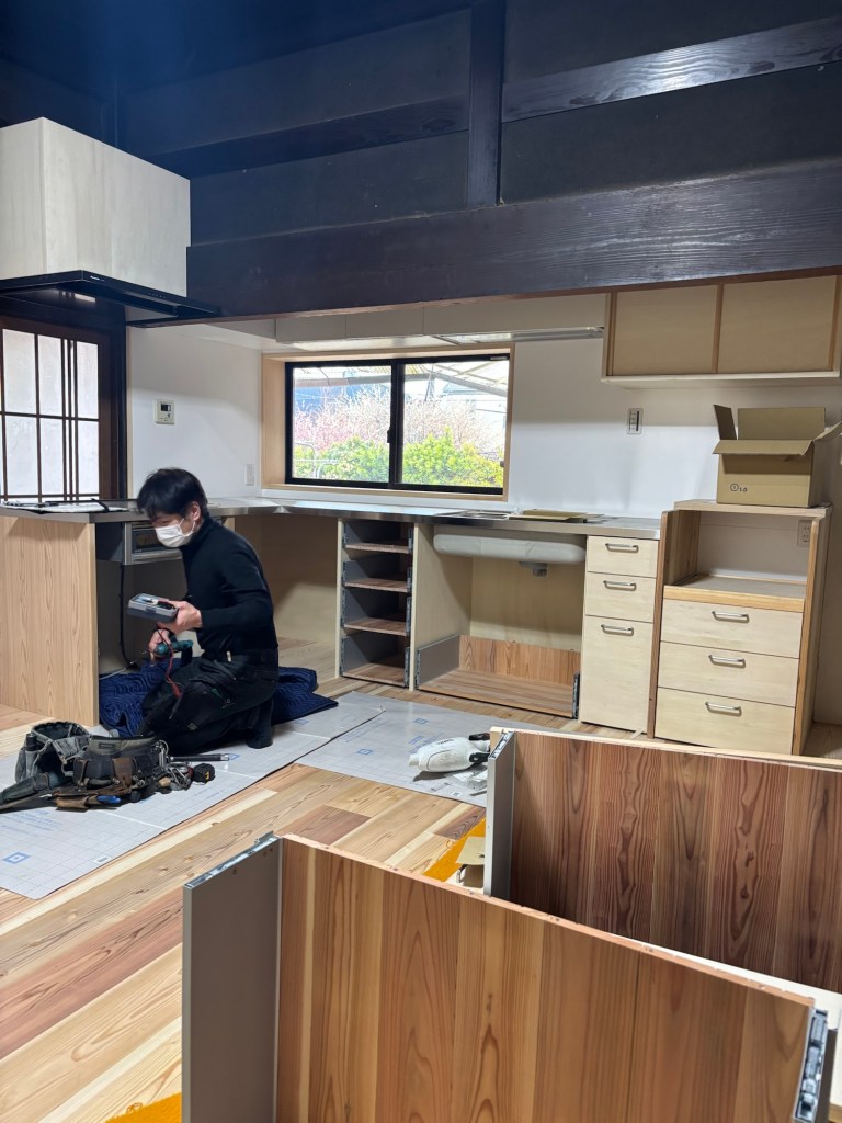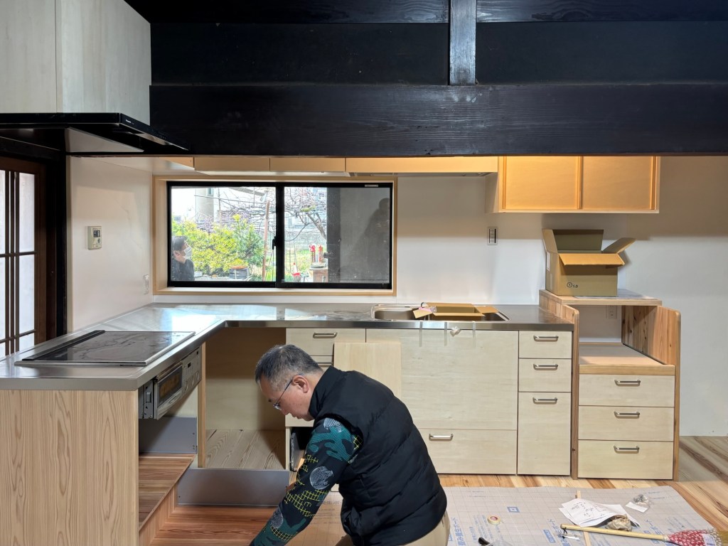 キッチンの扉と引き出し組み付けは建具屋さんにして頂いています。引き出しがたくさんありますが、ひとつひとつ丁寧に調整して頂いています。