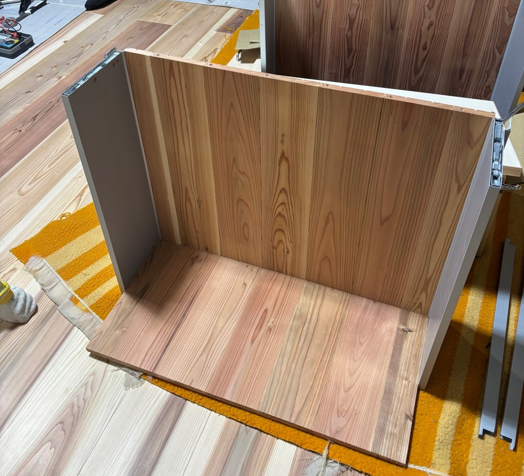 引き出し内部は杉板に。赤身の板を接いで使って頂いています。杉は調湿効果もあります。