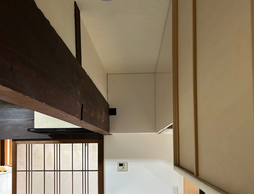 キッチン上部の見返しの垂れ壁は真壁に戻し、天井や小壁はほたて漆喰を塗っていただきました。右側奥の吊戸は電動昇降の吊戸です。動作もスムーズです。