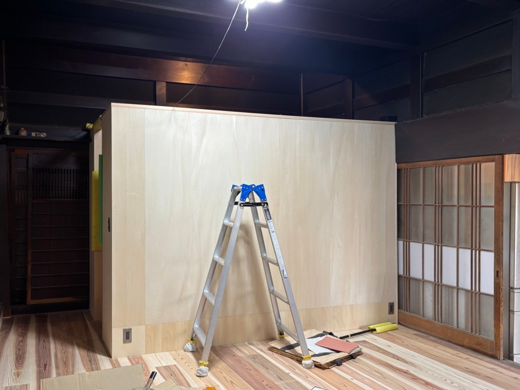 パントリースペースの仕切り壁。柿渋で古色に塗装するか検討しましたが、床が明るいのでこの壁も着色はしないことになりました。年月と共に色が濃くなり古材とも馴染んでくると思います。