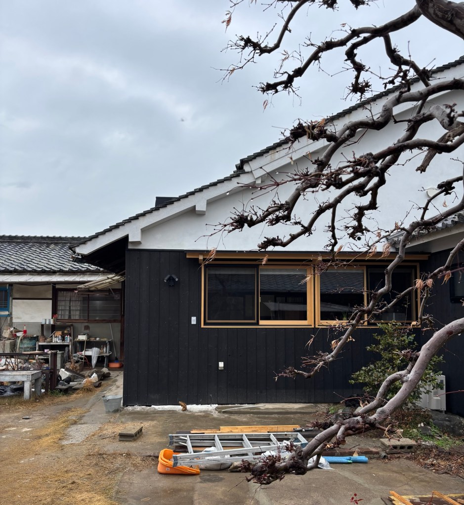 妻側の上部の白い左官壁も仕上がっています。腰張りは焼杉板です。改修部分の外壁は、外断熱で断熱材を入れ、通気層も設けて大壁で仕上げました。1月2月は、一期工事で仕上げたキッチンや部屋をお使い頂きましたが、温かくお過ごし頂いているとのことでした。